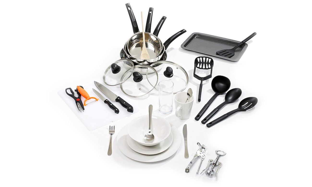 Sauce & Frying Pans | Baking Tray | Chopping Board | Chef’s & Utility Knifes | Solid Spoon | Ladle | Potato Masher | Slotted Spoon | Turner | Tin Opener | Corkscrew | Peeler | Kitchen Scissors | Wooden Solid Spoon | Dinner Plate | Side Plate | Bowl | Mug | Tumbler Glass | Knife | Fork | Dessert Spoon | Teaspoon